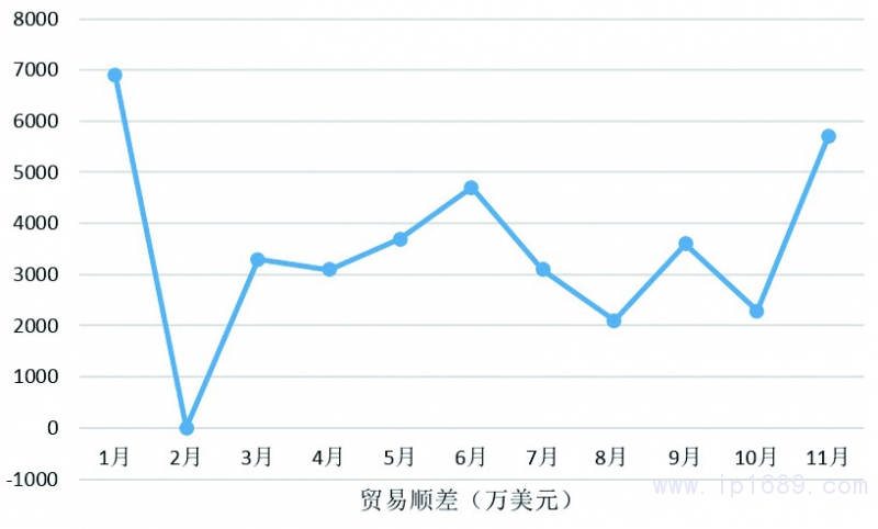 圖4 2017年1-11月我國塑機貿易順差走勢
