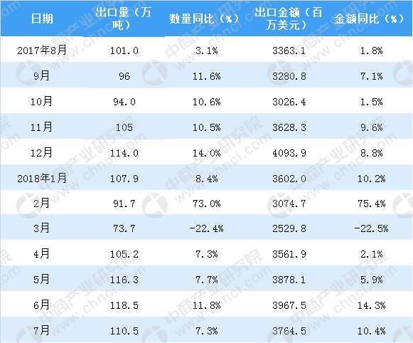2017年8月-2018年7月中國塑料制品出口情況一覽表