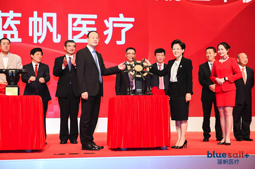 上市儀式以藍帆集團董事長李振平先生、藍帆醫療董事長劉文靜女士、中信產業基金總裁田宇先生、山東省淄博市副市長蓋衛星同志及山東省淄博市臨淄區區委書記宋振波同志共同敲響開市寶鐘收尾。