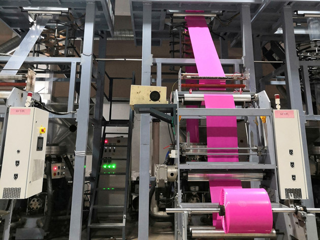 茂華公司,車間內共有15臺日強、鑄信吹膜機,機器源源不斷地產出全降解PLA、可降解PE包裝袋。在整個生產過程中,從吹膜到印刷到切袋都是一條龍服務,僅需少量的人工就能實現自動化生產。